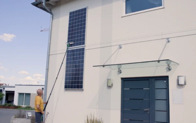 The Aqua Clean Deluxe has a lightweight telescopic aluminium pole with thousands of nylon bristles on the brush heads and two power wash jets that stream onto the surface.